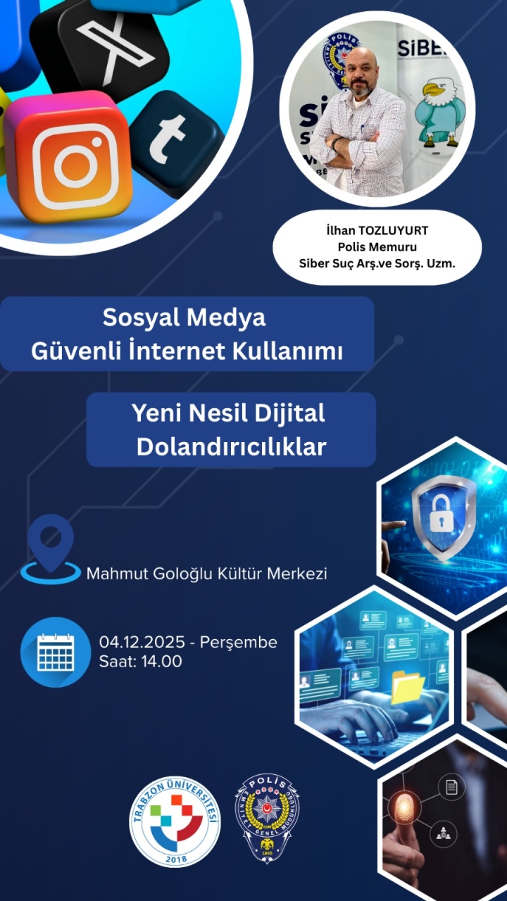 Trabzon İl Emniyet Müdürlüğü Siber Suçlarla Mücadele Daire Başkanlığı tarafından yürütülen SİBERAY programı kapsamında, “Temel Siber Güvenlik, Bilişim Suçları, Sosyal Medya ve İnternet Dolandırıcılıkları – Farkındalık” konulu bilgilendirme eğitimi 04 Aralık 2025 tarihinde Mahmut Goloğlu Kültür Merkezi’nde gerçekleştirilmiştir.